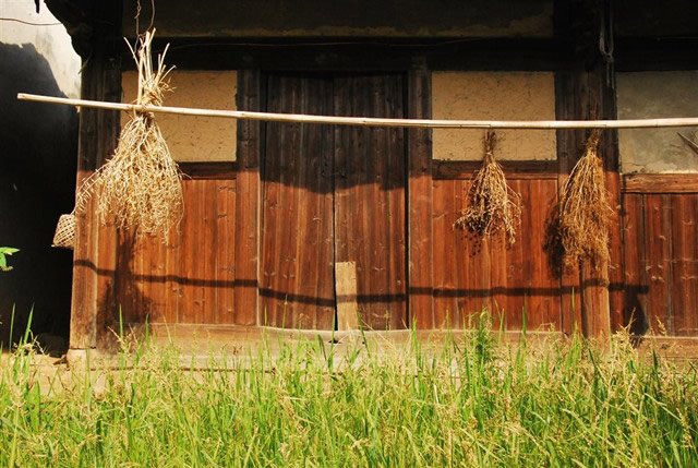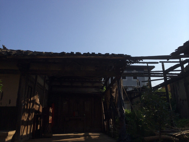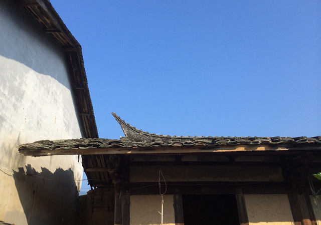 推开老宅老宅斑驳陈旧的木门,上世纪的生活气息扑面而来,杂草丛生的院落里,堆放着一些古老的农具,在屋前的细绳上,还晒着一些有些陈旧的衣衫。这个老宅原本是一个有“三进”的大宅,东西两面的厢房目前还保存较为完整,主屋中部的厅堂十分宽敞;主屋右侧的一间房因为火灾已经被烧坍塌,只剩下几根被烧得焦黑的梁柱;穿过主屋西侧与院墙之间的过道,就可以进入后院,后院厢房的左侧已经倒塌,只剩下二层的绣楼。稼穑轩无论是厢房的土夯墙还是主屋的有着浮雕的斗拱,都还显露着年代久远的印记,与现今的建筑材料判若两世。
