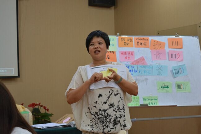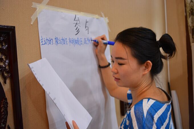 随后,引导师罗筱让大家分为三、四人为一组,各自讨论“引导、管理、参与、学习、等级、对话” 进行讨论,然后在墙纸上写出自己对其的定义。“参与是不同诉求的认为达到共同目标一起努力;对话是追求共同,有很强大的方向,极力追求过程中的共同性,是你来我往的博弈过程;等级是传统的结构,有着灵魂人物,自上而下的一种领导决策,并且尊重个体的差异性,实现共同的追求······”几番讨论后每张墙纸上都写上了各个小组对于词语自己的定义,“引导者在处理不同意见的时候要每个人都有所参与,帮助实现共同的过程,充分表达自己的观点和诉求,尊敬和理解每一个参与者。”引导师在随后的介绍中说道。