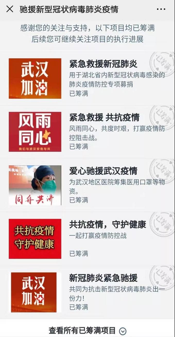 在腾讯公益等网络筹款平台,多个抗击疫情相关公益项目在很短时间内迅速筹满