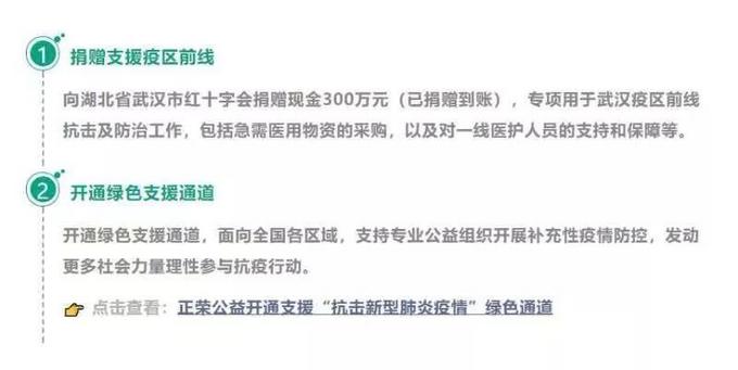 一是捐赠支援疫区前线,向湖北省武汉市红十字会捐赠现金300万元(已捐赠到账),专项用于武汉疫区前线抗击及防治工作,包括急需医用物资的采购,以及对一线医护人员的支持和保障等;二是开通绿色支援通道,面向全国各区域,支持专业公益组织开展补充性疫情防控,发动更多社会力量理性参与抗疫行动。
