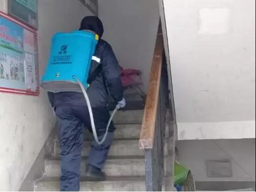 1月30日,安徽省宁国市,宁国市义工联合会联合西津街道凤凰社区对无物管小区凤形商住楼公共区域进行消毒,并对小区居民进行疫情防控宣传