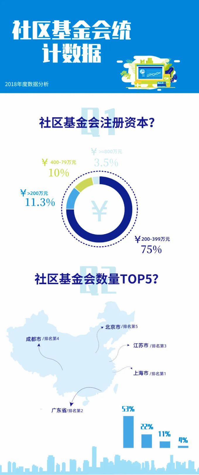 自2008年第一家社区基金会在中国落地,我国社区基金会快速增长,特别是自2014年起,社区基金会如雨后春笋般成立。2018年禾平台、武侯社区发展基金会支持ABC美好社会咨询社发起调研,调研报告显示全国登记注册社区基金会有141家,注册资本在200-399万之间的占75%。成立数量排名前五省份分别为上海(74家)、广东(31家)、江苏(15家)、浙江(5家)、北京(4家)。