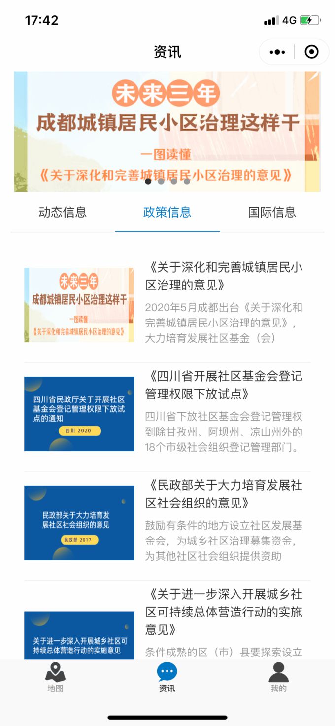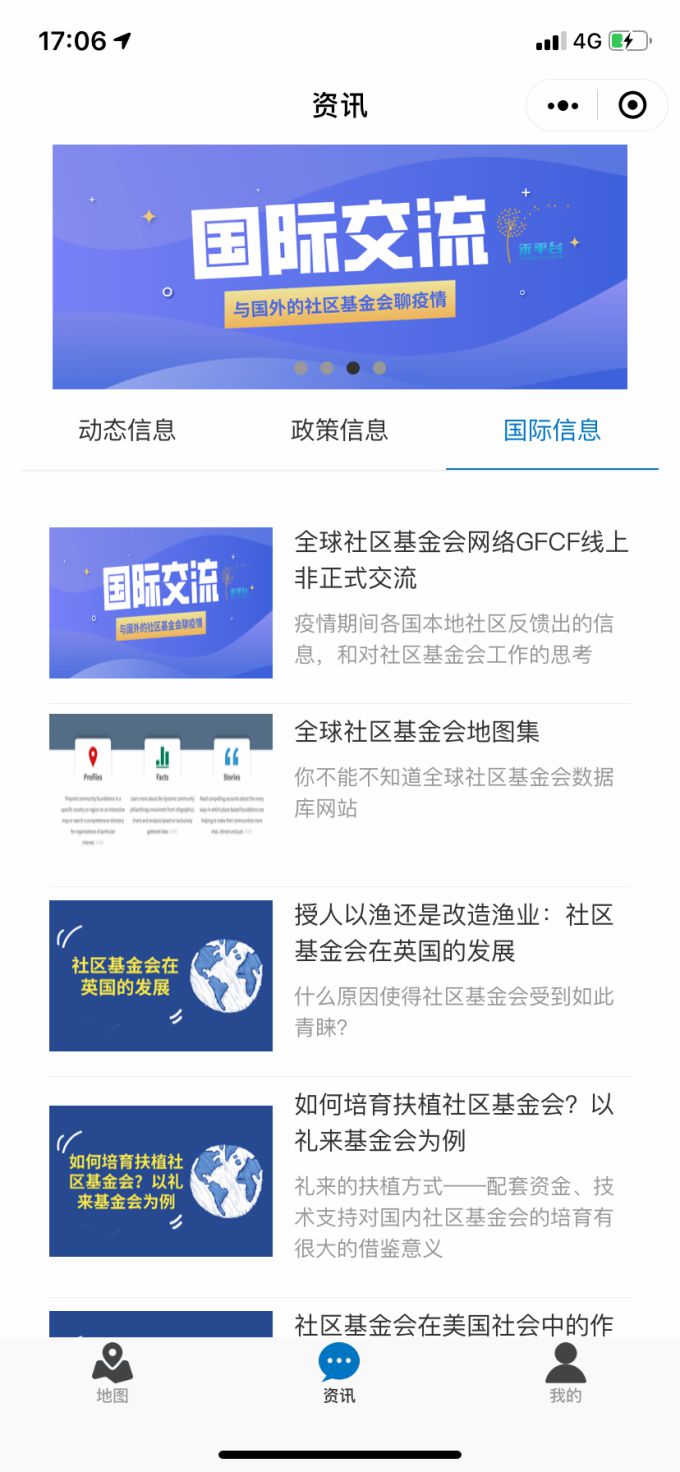 在“资讯”版面,我们会及时推送社区基金会的重大信息,包括社区基金会家长里短的“动态信息”、关于社区基金会管理政策的“政策信息”、拓宽视域了解国外社区基金会的“国际信息”三个板块。