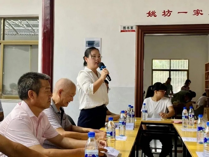 省工商联会员部副部长、派驻连城县莲峰镇姚坊村党支部第一书记郑芷介绍姚坊村光彩图书馆筹建情况,并讲述筹建图书馆的初衷。