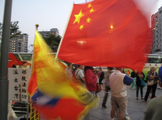 台湾的历史,的确正被改写。解严使得台湾社会社会发生松动。解除“党禁”,带来了集会、结社、组党的政治自由;解除“报禁”,带来了报纸、新闻出版、媒体表达等言论自由。这种自由,在当前的台湾每个角落,都是清晰可见的。比如,象征台湾资本主义最高成就的101大楼,在楼前可以有大批法轮功练习者的“血泪控诉”,与之相毗邻的,也有同样一大批反对法轮功的人士,举着五星红旗和中华民国国旗,高奏义勇军进行曲,以及“我们都有一个家,名字叫中国”,对法轮功练习者嘶吼:邪教法轮功滚出台湾(见图1)。只要无人投诉,自由组党结社、自由集会游行,在公众场合也可以这样自由表达。