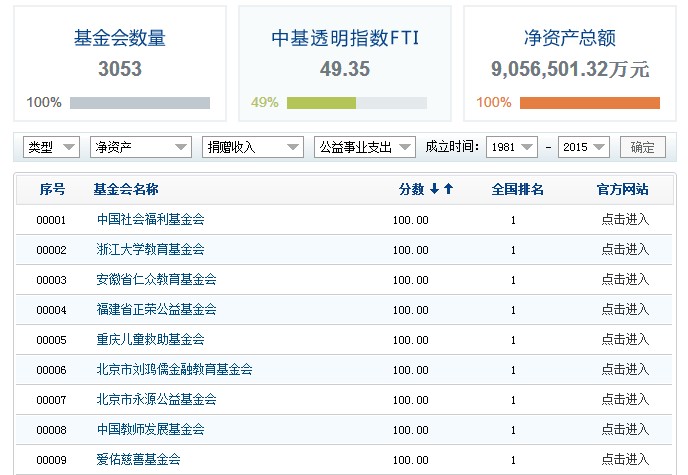“中基透明指数”由基金会中心网开发,是一套综合指标、权重、信息披露渠道、完整度等参数,以排行榜单为呈现形式的基金会透明标准评价系统。“中基透明指数”主要披露基金会的基本信息、财务信息、项目信息和捐赠信息,满分100分。指数的数据采集公开,结果由系统自动生成,确保客观公正。从计算结果来看,中国基金会行业的透明度总体状况并不理想,3053家基金会平均FTI得分仅为49.35分。