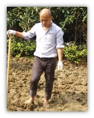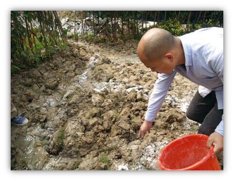 军军作为团队领导,第一个做出了示范,赤脚挖泥,来个与自然亲密自然。