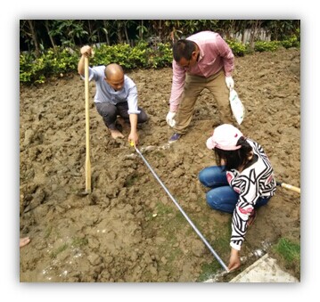 丈量尺寸,开挖小池塘。在各位的努力下,噔噔噔~菜园池塘初具雏形