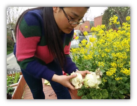 下午,大家稍作休息,采摘了先前种下的新鲜的生菜并修剪青菜花枝的同时又种下了新鲜的土豆,等待它生长、发芽。采摘过程用四个字形容:不亦乐乎!