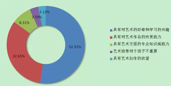 调查结果显示,96.41%的家长认为艺术修养对孩子来说是重要的。超过半数的家长认为孩子具有对艺术的好奇和学习的兴趣最重要(52.32%),其次为对艺术作品的欣赏能力(32.65%)。认为具有艺术方面的专业知识或能力最重要的仅占8.31%,认为艺术创作的欲望最重要的仅占3.13%。如图1所示。