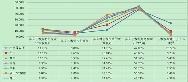 对不同学历水平受访者的观点进行分析,认为“具有艺术的好奇和学习兴趣”最重要的在各个人群中均在半数左右;而认为“具有对艺术作品的欣赏能力”最重要的,随学历不同略有差别,大体上学历越高,认为对艺术作品的欣赏能力重要的比例越大。此外,小学及以下学历者认为艺术修养对于孩子不重要的比例最高(23.53%)。如图2所示。