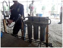 图7 当地组织接收净水桶 图8项目专员介绍净水桶使用 图9项目专员讲解设备维护注意事项