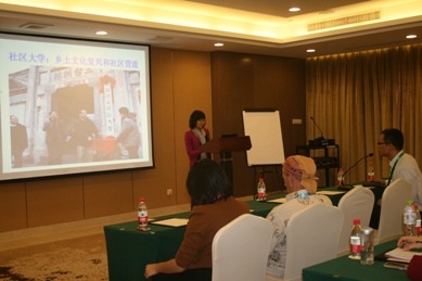 高峰论坛上,中间为唐凯国际的策展人度度女士。左一为故乡农园工作人员乐超;左二为来自中国计量学院的