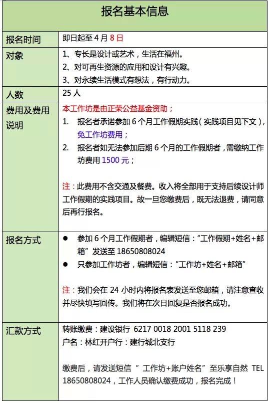 本项目由都市绿生活工作坊和六个月的工作假期两部分组成。我们希望通过工作坊的形式,招募生活在福州,关心自然环境的建筑、景观、室内、平面、服装、工业产品的设计师或艺术工作者,以及对生活设计有想法,有行动力的人,一起学习永续设计,一起用设计与艺术的力量,创造绿色生活模式。