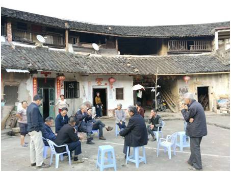土楼原住民、项目发起人林炉生带领社区营造组召集村民、起草公约。如何让村民参与进来呢?直接找住户商谈并不是最有效的办法,我们首先要征询村委和村里德高望重的老人的意见,于是,炉生找来了村委代表和村老人协会会长,通过他们来动员村民。