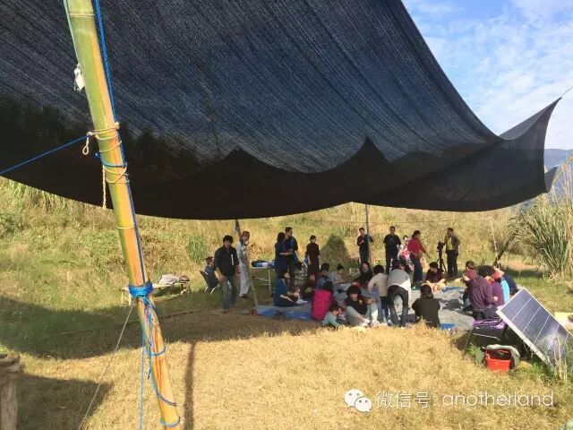 2015年10月25日,大家一起搭建广场遮阳棚。晚间请薛经贸和林则忠来客栈分享农耕和食品安全知识。