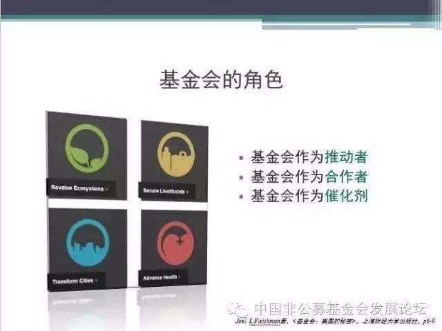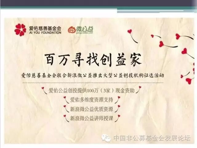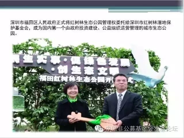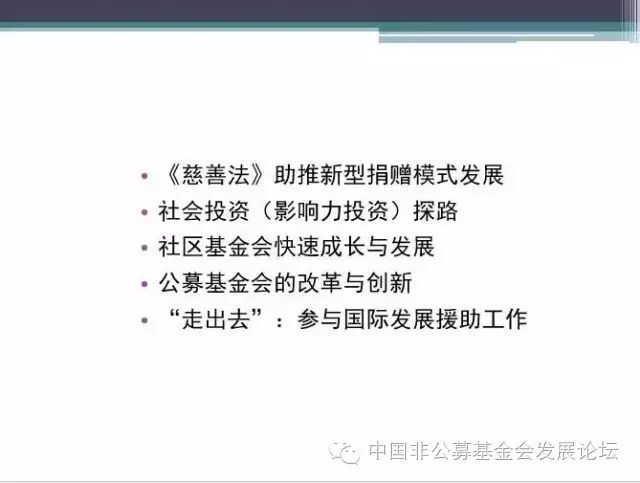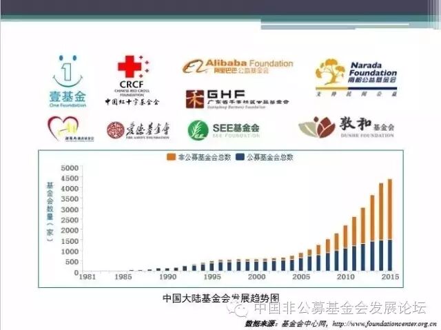 论坛组委会出了这个题目,我想更多的是站在这么多年在对整个基金会行业发展的一些观察来提出我自己的一些思考,期望能够对我们湖南本土的基金会和公益同仁有所参考和启发。我自己又改了个小题目,我称之为《探索面向未来的公益发展模式——基金会的价值创造与影响力构建》。首先,(彭)艳妮秘书长给了我们一个很好的背景和趋势,我作为第二位发言人,我想在她的基础上更多的聚焦于基金会所处的一个社会环境。我想,用一句话来形容的话,更多的是放在社会建设与社会体制改革的大背景下来思考基金会本身的定位和基金会的价值创造。首先,我自己从三个维度来看待这个问题。我们知道,基金会和公益行业发展有最重要的三个纬度,一是制度纬度。我们知道,中国公益组织的发展源于制度的创新,在北上广深、湖南等中部优先地区,还有成都这些地区,最早开始推动社会组织快速发展的是源于制度的突破,我们知道最开始是制度破冰直接登记注册,在这种情况下以十八大提出的政社分开、权责明确、依法自治的现代社会组织体制建设,在这样一个目标下社会组织得到了快速成长和发展。二是资源纬度。这些组织成长起来了,资源在哪里?我想在资源层面又有两个非常重要的变化,第一个层面来自于政府层面,我想在座的湖南、长沙的朋友都能感受到,在政府层面、资源层面主要做出三种模式的探索。第一种称之为社会组织发展的培育扶持资金,各个省、市,甚至区级层面,都设立数额不等的社会组织培育发展基金,对于那些新创、初创期的组织进行扶持;第二个层面是大力推动政府购买社会服务;第三个层面是很多地方正在实施的类似于公益创投的方式来支持社会组织的发展。大量资源平台搭建,在志愿者服务中有志愿者服务交流会,有慈善项目推介会,还有社会服务洽谈会,民间层面各种能够把资源和公益项目相匹配的平台正在快速出现。非公募基金会代表的是什么?其实代表一种民间层面成立的基金会,而过去大量的公募基金会是带有自上而下的政府背景,但非公募基金会代表民间基金会的发展。三是能力纬度。我想驱动整个层面发展,来自于政府层面最重要的是我们感受到各地的政府正在大力推动类似社会组织的培育和孵化基地的建设,我知道湖南要快速推动社会组织培育孵化基地。在民间层面大量基金会开始支持人才的建设,支持枢纽型组织的发展,支持行业、平台的搭建。所以,从制度、资源和能力这三个层面,对于基金会处在什么样的地位,我想我们已经有了非常好的了解。下面,展现几张图。在这样的情况下,整个基金组织的数量发展得非常快,已经超过了60万家。在《慈善法》出台的时候,当前的捐赠已经超过了1000亿,是2006年的10倍,2006年只有100亿,这张图只能看趋势,可能很多数据没有统计在内,但这是民政部发布的一个数据。2008年是公益元年,从捐赠可以非常明显的看到这样一个趋势,从2009年到现在数据都没有掉下来。 从基金会的发展可以看到,从《2004年基金会管理条例》正式出台以来,基金会的发展进入到了飞速发展阶段,特别是在2010年的时候,非公募基金会数量超过了公募基金会的数量,意味着民间资源正在大量集结。从非公募基金会发展论坛的视角来看,我自己理解可以分为几个阶段,第一个阶段是2004年至2007年,《基金会管理条例》颁布之后,非公募基金会主要以传统慈善为特征。在2008年汶川地震发生之后,以(彭)艳妮所在的南都公益基金会为代表,在2008年相当长的时间内,民间公益组织得到的主要是国际资助,但2008年之后国内基金会开始资助,开启了本土基金会资助的模式。在2009年,中国非公募基金会论坛得以诞生,可以看到非公募基金会论坛组委会成员大部分是国内最早开始资助民间公益或者践行资助理念的基金会在成长。我们知道,从2010年开始,国内公益生态进入到一个以基金会为龙头来打造公益价值链或者称之为公益生态系统的阶段,这个阶段一直延续到今天。所以,从这张图可以看到,我们对于基金会可能会有很多的定位。那么,一般的说法是基金会作为推动者,作为合作者,作为催化剂,我想拓展一下(彭)艳妮秘书长所谈的“驱动力”概念。我自己觉得观察2004年到现在,整个非公募基金会发展的历程,我们说,基金会的角色可能有很多种。但是,我想说的是,如果用一句话概括的话:基金会是中国现代公益慈善的一个“引擎”。我想这个“引擎”的作用正在得到充分的发挥。那么,我认为“引擎”有两种层面,我们经常说基金会有两种方式,一种是运作型的基金会或者是操作型的基金会,他推动的是中国公益、业务、项目模式的创新。最有名的例子是爱佑慈善基金会,比如他有非常多著名的品牌项目,“爱佑童心”在短短几年中,于2006年启动,当时做到了全球最大的孤贫先心病儿童医疗救助项目,他们是项目创新和业务模式创新的典范;还有上海真爱梦想基金会,他们的梦想教室、梦想中心,在2015年已经达到2088家,他们在教育领域探索一种全新的模式,他们是中国最优秀的操作型、运作型基金会;还有北京立德未来助学公益基金会,他们有一个“美丽中国”的宣传片,他们对全新教育模式进行了一种探索;还有广东深圳红树林基金会,他虽然是一家民间公募基金会,他们在今年年初的时候,(就是)这样一个关注红树林环保的基金会,他们成为