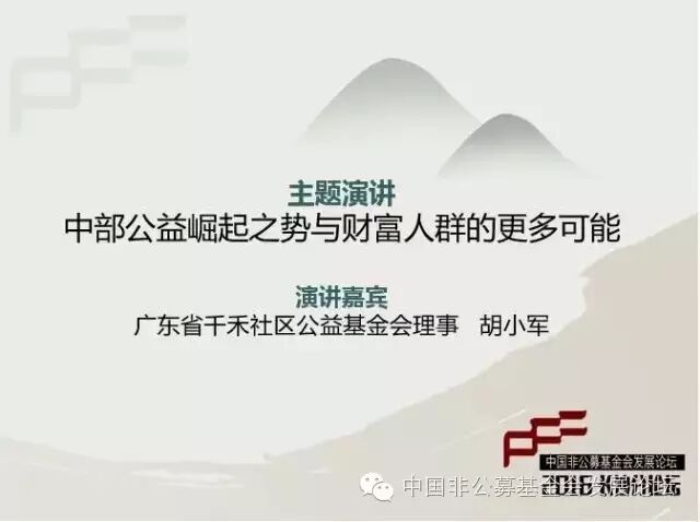 广东省千禾社区公益基金会理事胡小军老师在非公基2016长沙分论坛演讲非常感谢主持人,感谢各位老师和同仁,祝贺非公募基金会论坛走到第八届,并且分论坛落地长沙。坚持到第八届非常不容易,基金会本身就像彭(莎)理事长、张(帆)理事长在湖南乐意承担这样一些工作,本身是站在行业的视角来推动的,(在此我要)表达我深深地敬意。