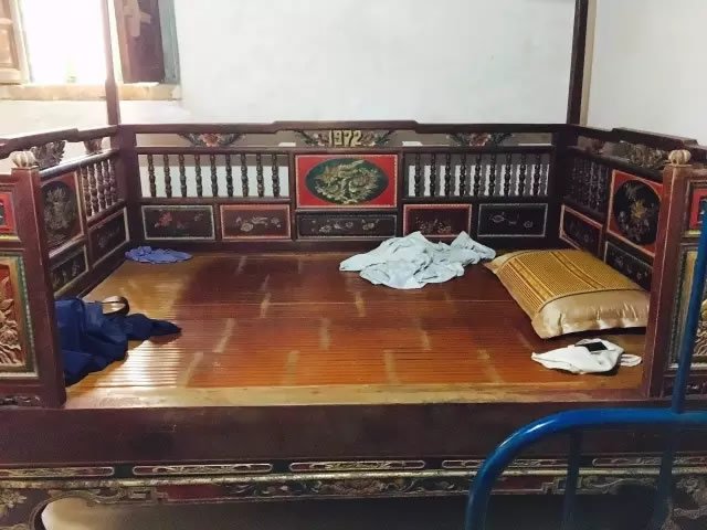 后来老阿姨带我们参观他们家,她拿出一个铺满了灰层但却保存得非常完整的小盒子给我们看,欣然地告诉我们这是她当年的嫁妆,脸上就像开出了花朵。接着还高兴地带我们参观了她的房间,告诉我们这是她的婚床,上面还刻着1972年。
