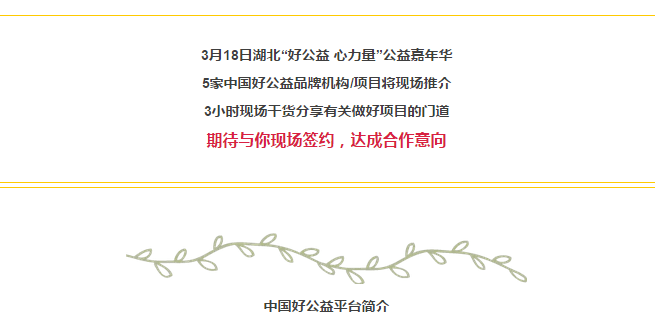 3月18日,武汉恩派社会创新发展中心、正荣公益基金会、中国好公益平台、武汉市社会组织发展基金会以及众多优秀的社会组织,联合奉上“好公益 心力量”湖北公益嘉年华。它将汇聚公益行业好的组织和项目,拓展你的公益视野,促成跨地域的合作;它将推出一箩筐的资源和机会,现场就可以申请;它将帮你打开新的世界,积蓄力量,共同推动湖北公益事业的发展。