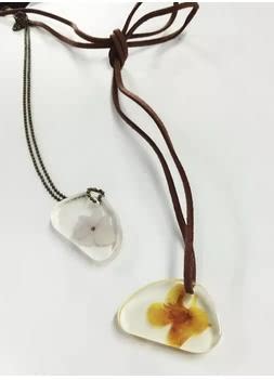 选择自然植物,压制成干花,再根据自己的喜好,将花叶放在底托上进行设计构图,就滴胶滴于底托上,静置干燥半日,一个植物滴胶作品就此完成。