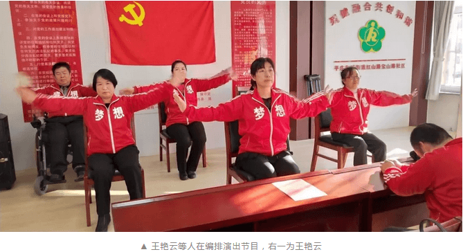 王 艳 云 是梦飞扬艺术团的负责人,1岁时就得了小儿麻痹症,但是在学校她的学习总是名列前茅。“可能是因为在学校里老师同学都挺呵护我的,所以那个时候感觉我的残疾并没有给我带来多大的打击”。王艳云说,成为一名集体工人,走上工作岗位后她开始感受到因为残疾带来的歧视。