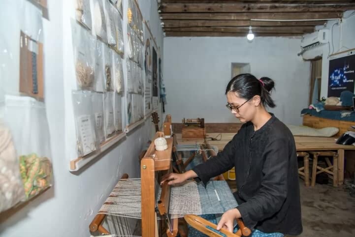 在村子里的工作室,我们看到了振振自己做的织布机,墙上还贴着许多纤维材料,都是她从各地采集而来用于研究整理的。其中一个装着葛根纤维的袋子上标注着采集地为“关中村”,振振对我们说:“这个葛根的纤维是在这里采集到的,我当初来到这个村子时,就有意识地对周围植物进行梳理,哪些适合用来染色,哪些适合用来纺织,我都把它们整理起来。”