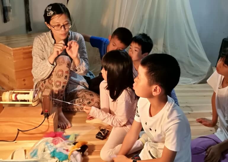 振振和孩子们一起纺线