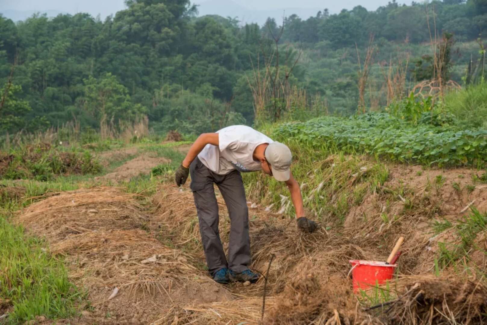 “山上的庙供奉着很多神仙,据说还有一个狐仙呢!”大王一边挥着锄头,一边对我们说。清晨 6 点的山上还算凉快,这几天他总是趁着太阳出来前上山干活,“否则天热起来就什么也干不了了。”2015年加入南部生活共识社区后,大王觉得既然回到乡村,自然就要拿起锄头。