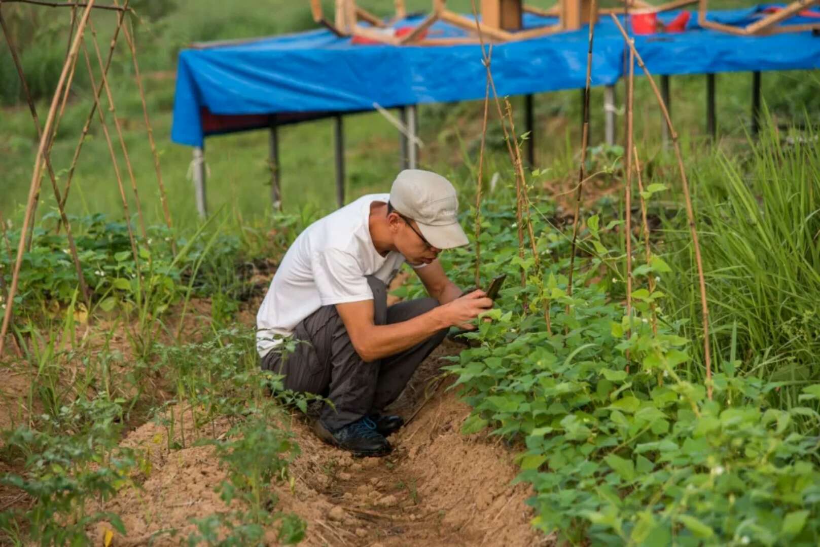 他租下山上的地,尝试种了很多豆科类作物,目前百分之八十都成功了,“你看这是四季豆,这是毛豆、黄豆,那边种了花生。”大王带我们走在田埂间,一路比划着,笑着说自己种了一堆下酒菜。田边还有他种的桃树、李树、无花果,以及银杏、紫薇和石斑木这样的观赏树。