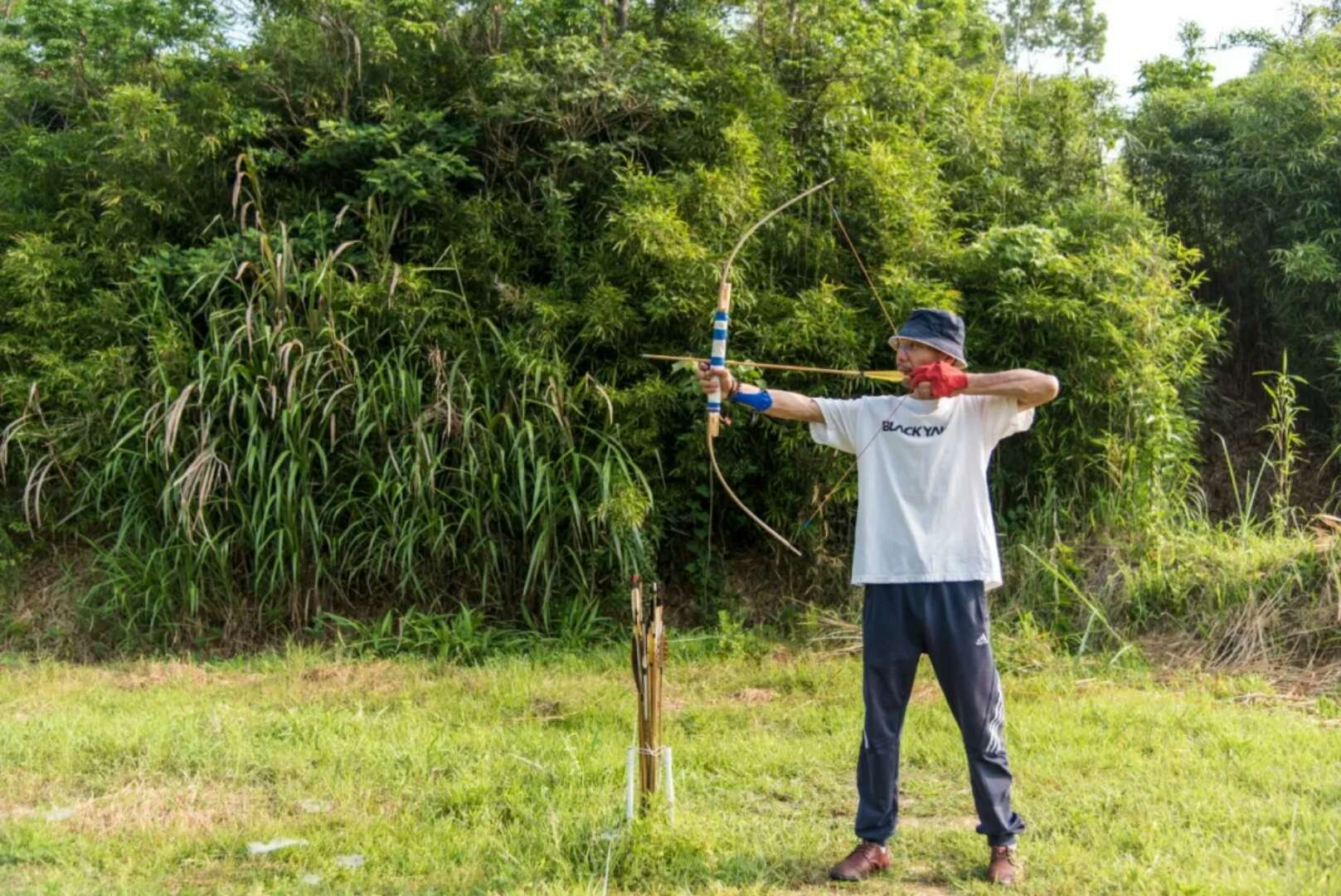 即将结束今早的劳作时,大王往远处瞥了一眼,对我们说:“看,于伯公老师也上山来了。”此时一个黝黑的身影,背着弓箭正往立着箭靶的草地走去。每天清晨,于伯公都会来山上射箭,他熟练地套上防护用具,搭箭,拉弓,释放,一支箭的运行轨迹也就是一瞬间的事。