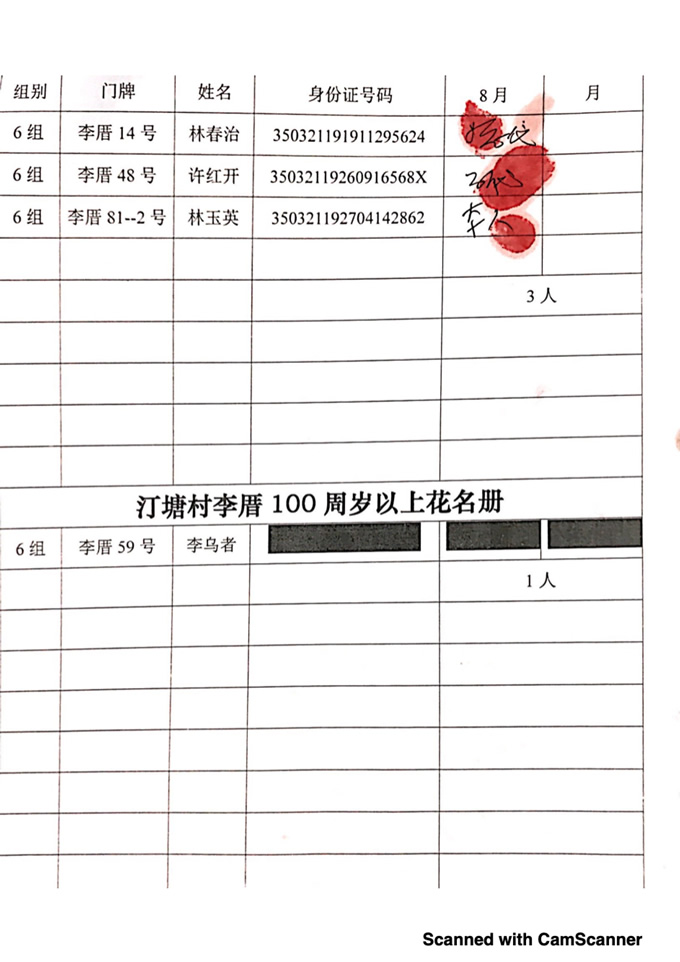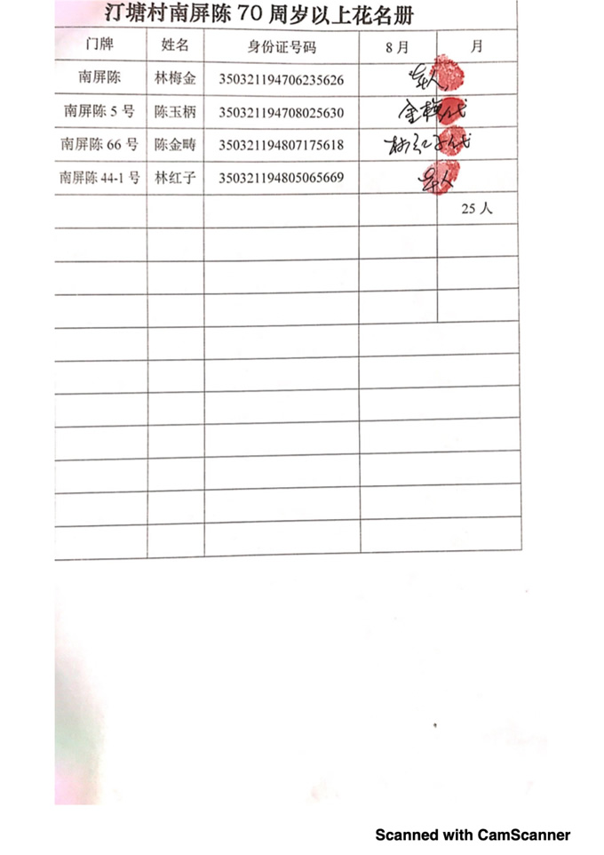 2018年8月,项目为汀塘村70周岁以上的老人发放400-1000元不等礼金(70-79岁老人,一个月400元;80-89岁老人,一个月600元;90-99岁老人,一个月700元;100岁及以上,一个月1000元。)