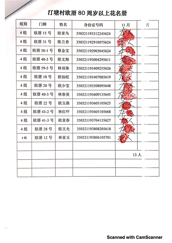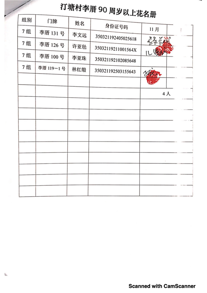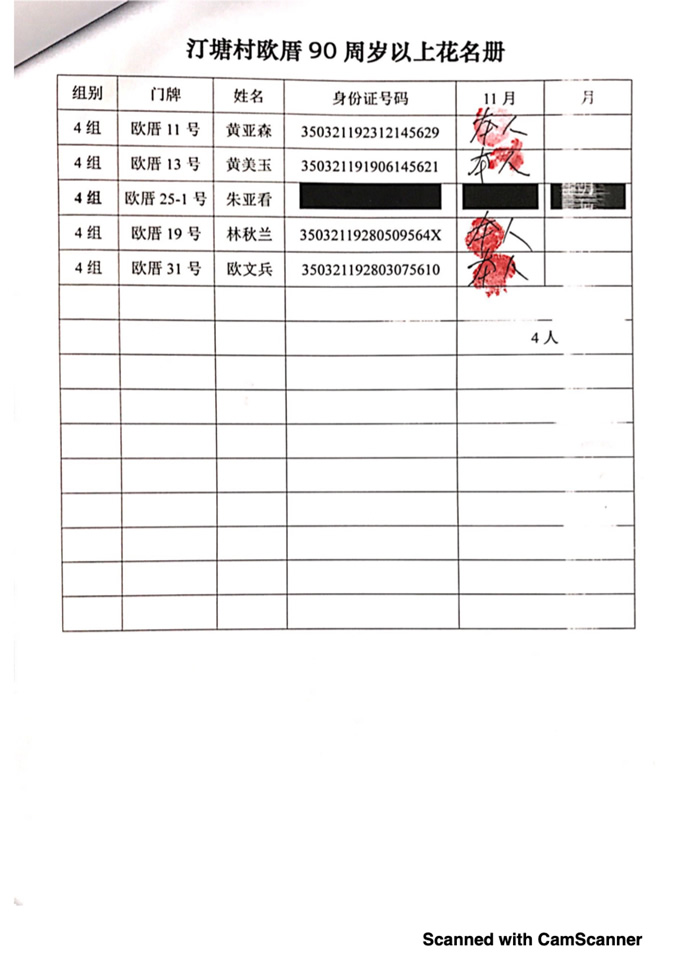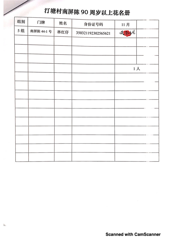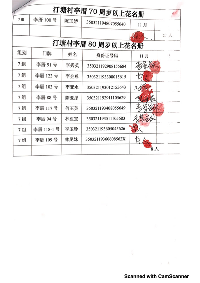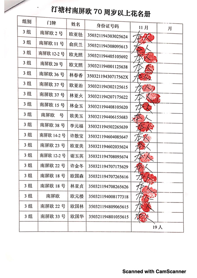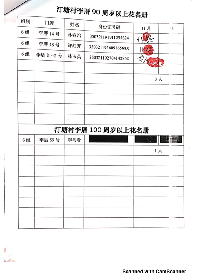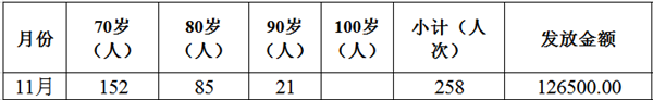 2018年11月,项目为汀塘村70周岁以上的老人发放400-1000元不等礼金(70-79岁老人,一个月400元;80-89岁老人,一个月600元;90-99岁老人,一个月700元;100岁及以上,一个月1000元。)