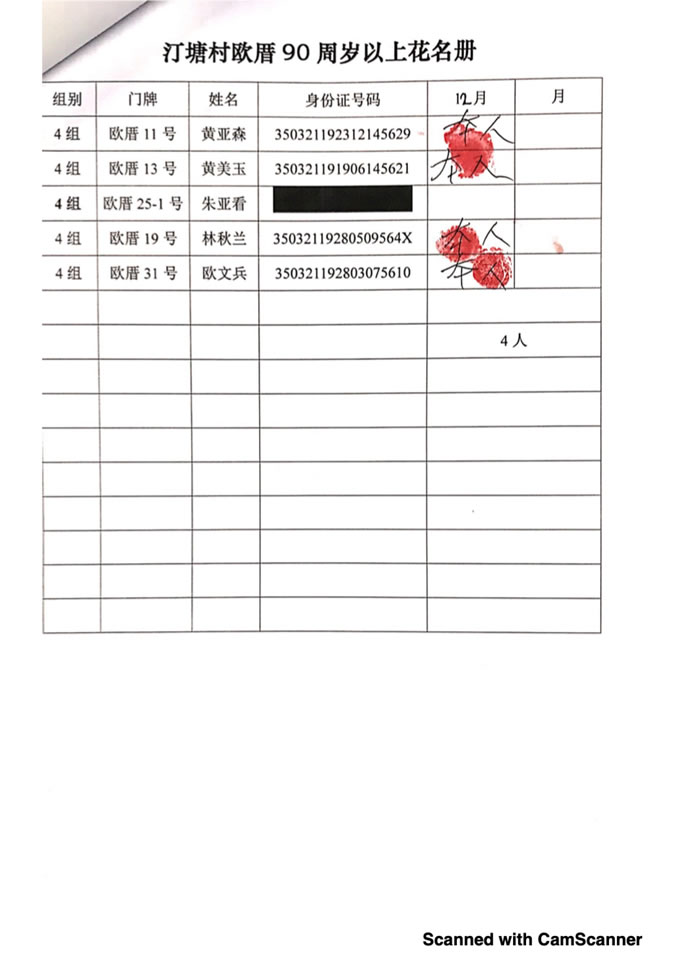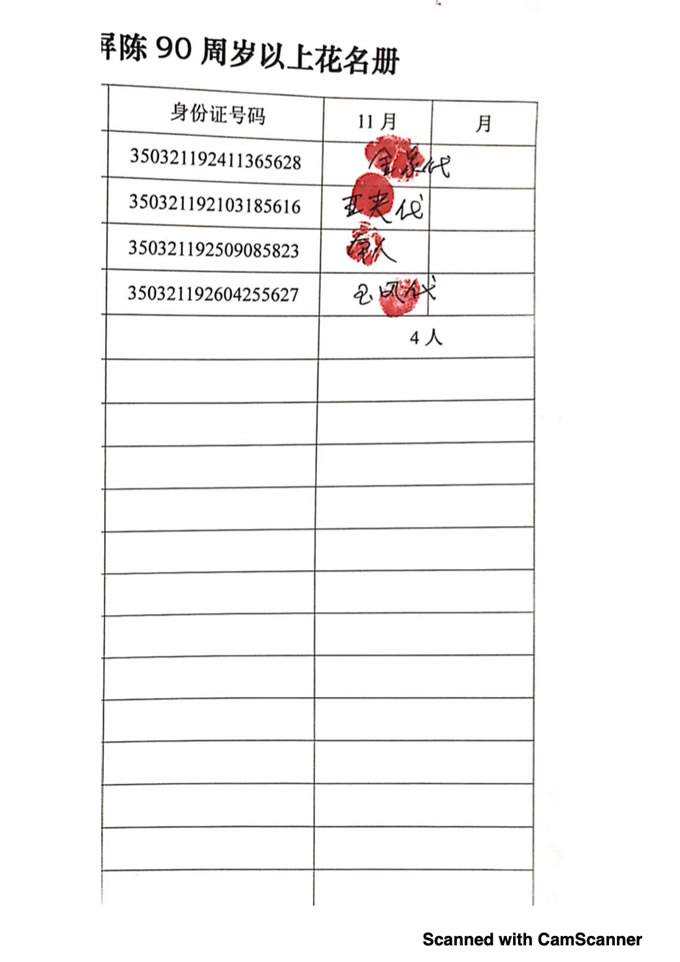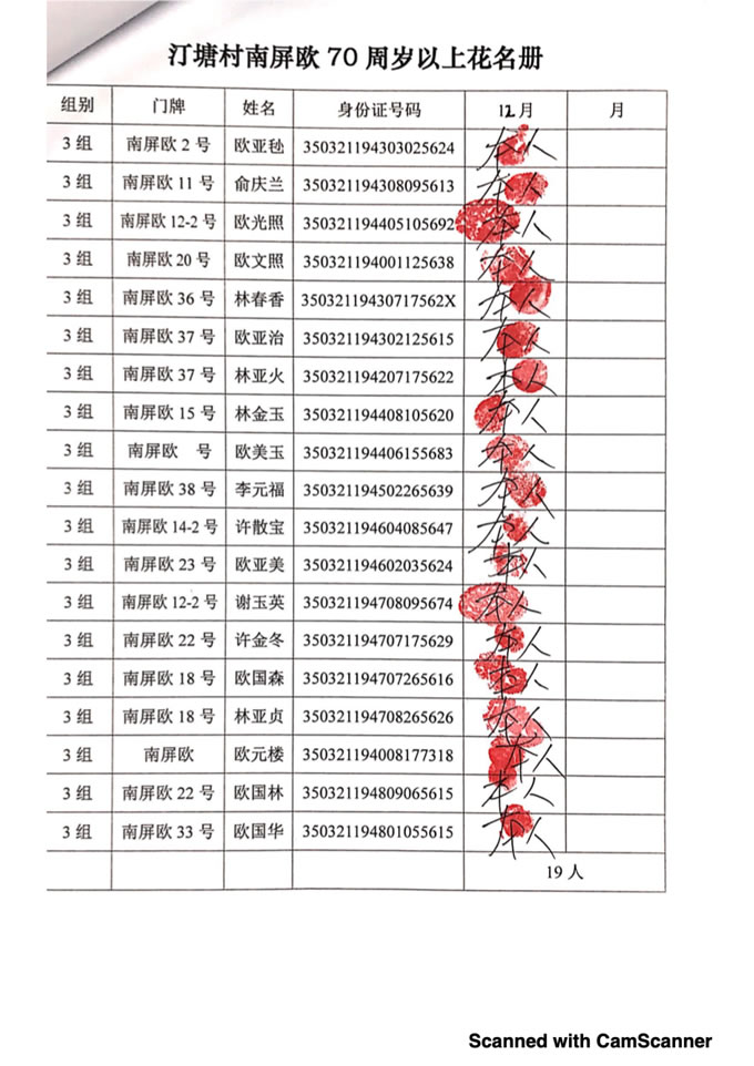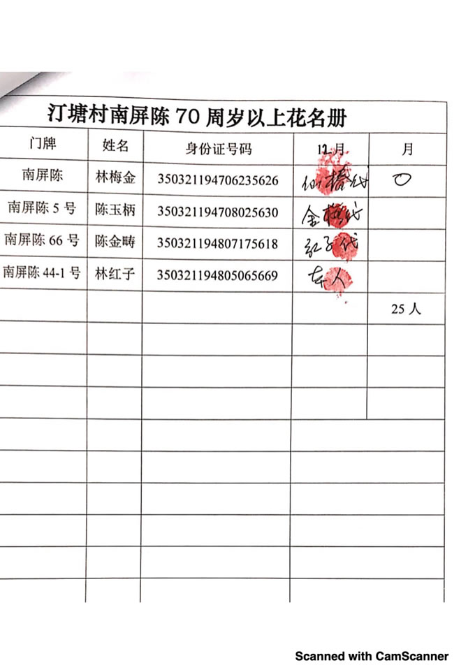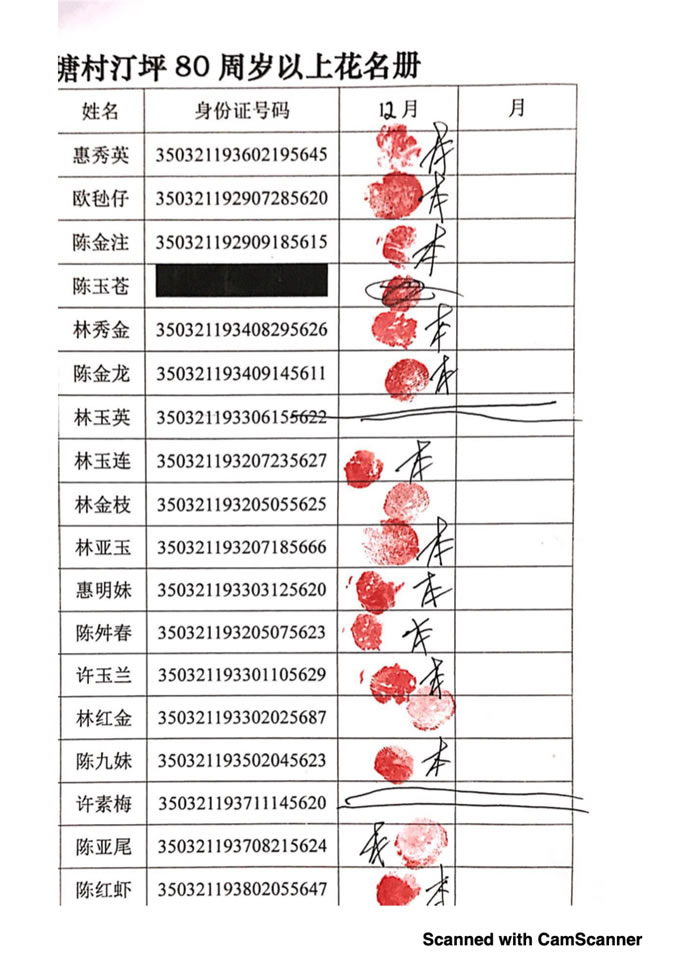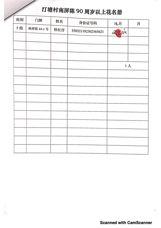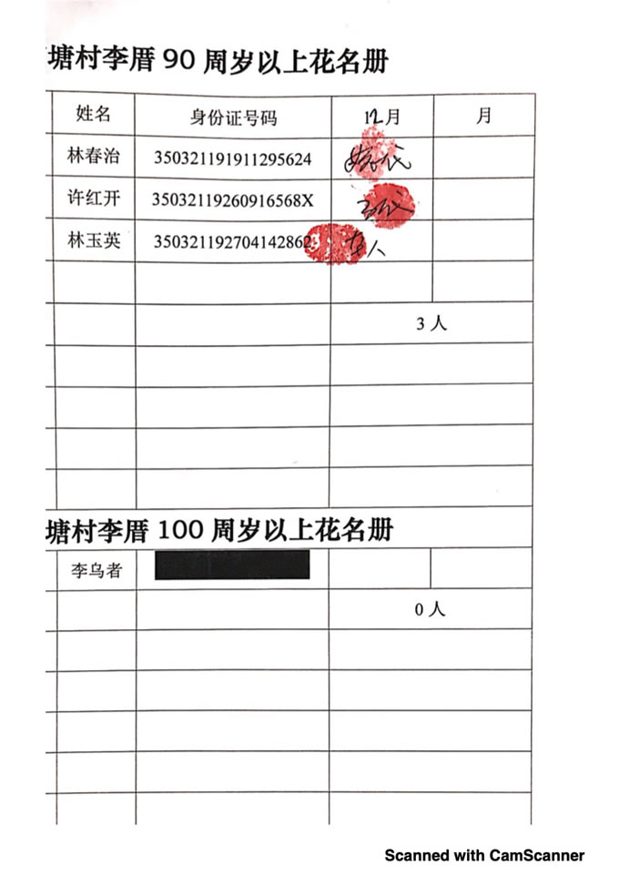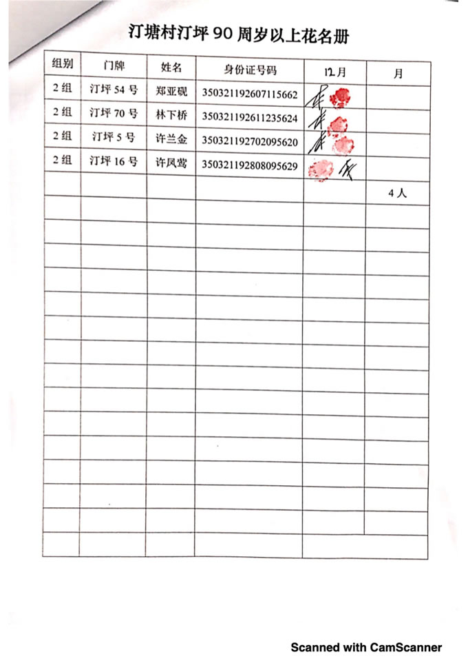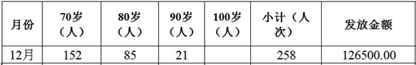 2018年12月,项目为汀塘村70周岁以上的老人发放400-1000元不等礼金(70-79岁老人,一个月400元;80-89岁老人,一个月600元;90-99岁老人,一个月700元;100岁及以上,一个月1000元。)