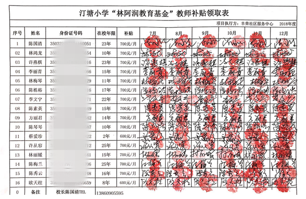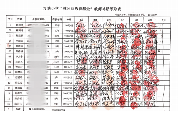 下表为2018年度汀塘小学“林阿润教育基金”教师补贴领取表。