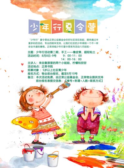 通常以手工、阅读、以及其他娱乐类活动为主,用以丰富业主的生活,同时给业主提供交流和休息的平台。苏州正荣书院目前结合暑假情况,将常规性活动的时间暂定在每周二、周四下午14:00——16:00。