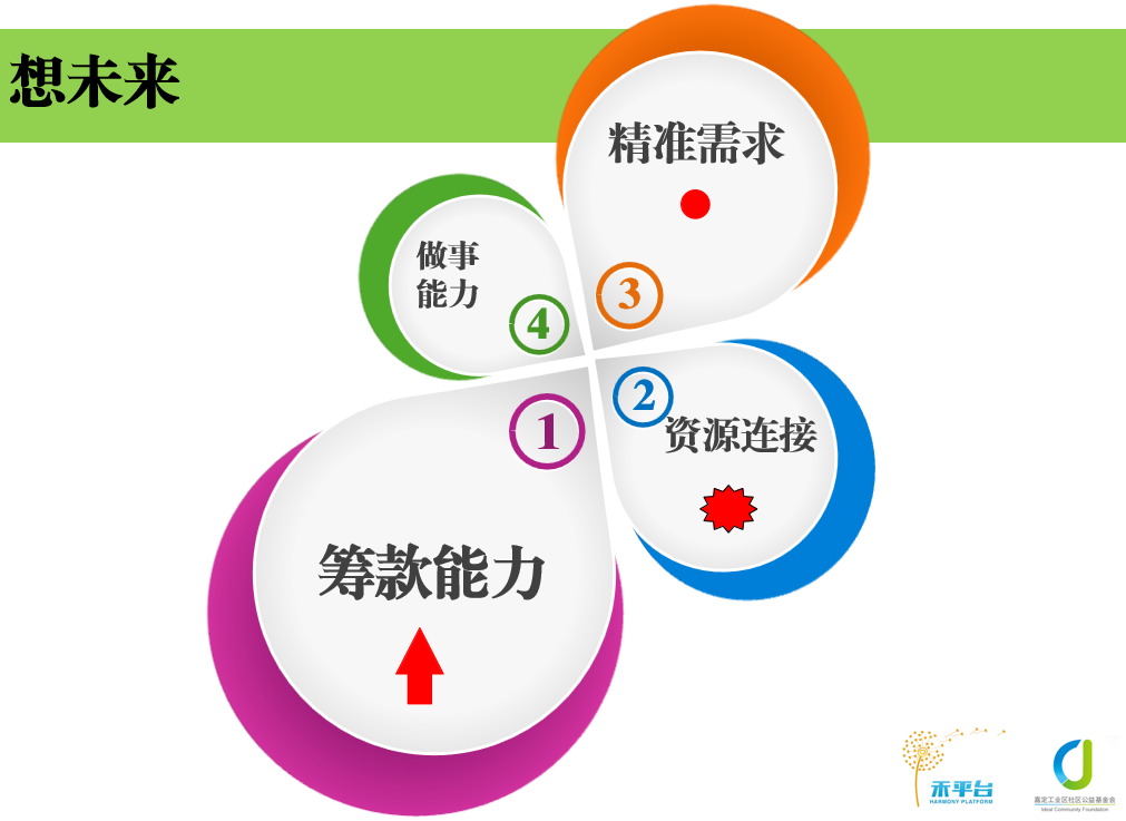 最后,以嘉定工业区社区基金会来说,面临的问题:自身团队发展的问题或说筹款能力的问题,或者我们资源筹集的问题,还有精确需求定位的问题,因为资助的操作一切来源于发展的需求。