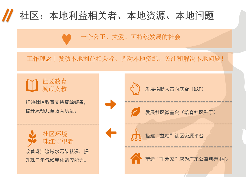 作为一家社区基金会,任何公益资源,理论上在我们的台上都能够找到实现价值的可能,这同时也对社区基金会自身的能力提出非常高的要求。此时我们慢慢发现,过去千禾的地域范围是南中国那么大,虽然辐射的范围很广但连接力非常弱,但当我们聚焦到珠三角之后,不仅仅资源没有受地域的局限反而影响的范围更大了。越来越多外部的资源关注到珠三角的发展,这些资源愿意跟地方性的基金会进行合作,这个时候,社区是一个利益共同体的概念。