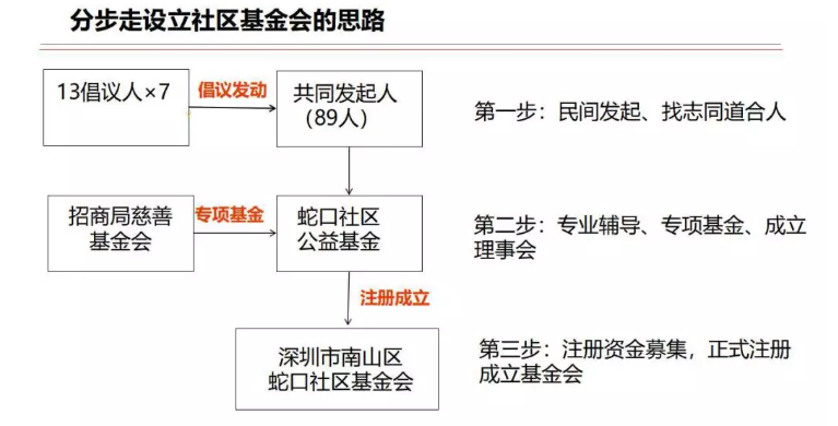 2.89位发起人每人出资1000元,共8.9万元,在招商局慈善基金会下面设立一个专项子基金——蛇口社区公益基金,2014年12月,召开全体发起人大会,选举产生理事会,并授权理事会组织筹备社区基金会。