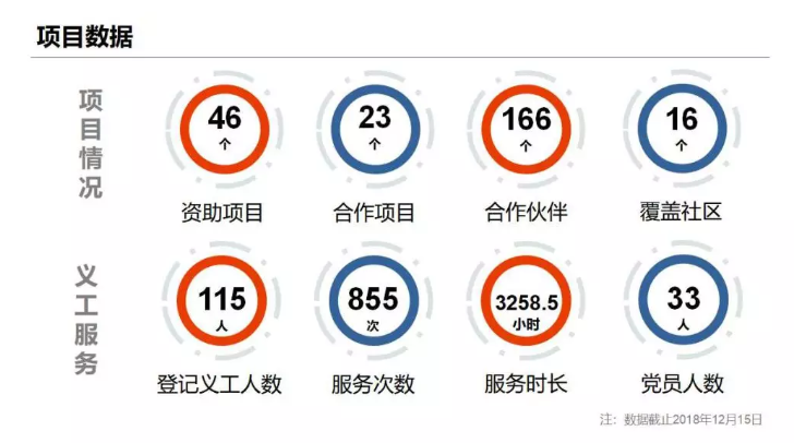 我们总共资助了46个项目,合作项目有23个,合作伙伴就是社区内的各种社会组织,一共有166个,覆盖了16个社区。