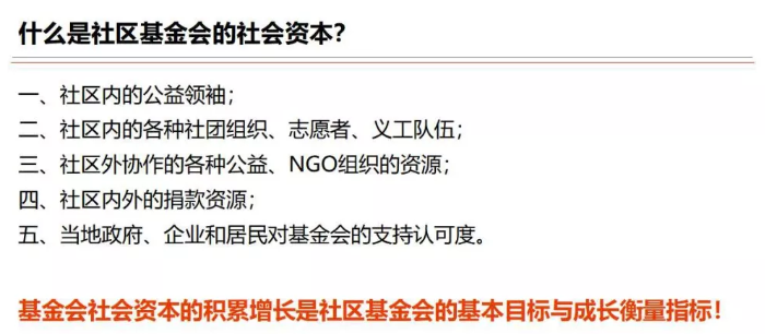 最后还想谈一点我们的认识,社区基金会在追求资本金增值同时,要注意积累和增加社区基金会的社会资本。