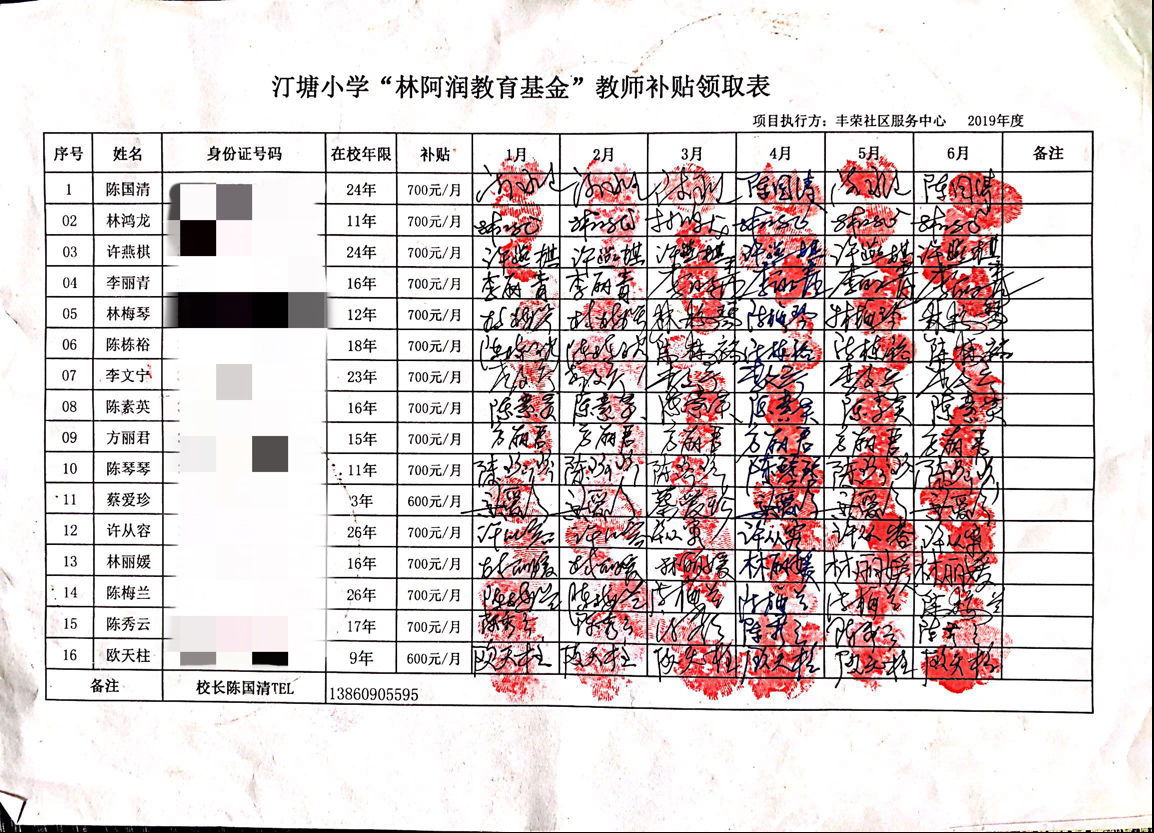 下表为2019年1-6月汀塘小学“林阿润教育基金”教师补贴领取表。