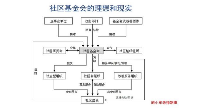 胡小军老师做的这个图它把社区基金会所处的社会治理的结构体系全部给画出来了,其他的各种主体都要通过社区基金会建立起关联并为不同的主体去提供资源资金。这个理想模型是一定要有一些前置条件才能实现的。