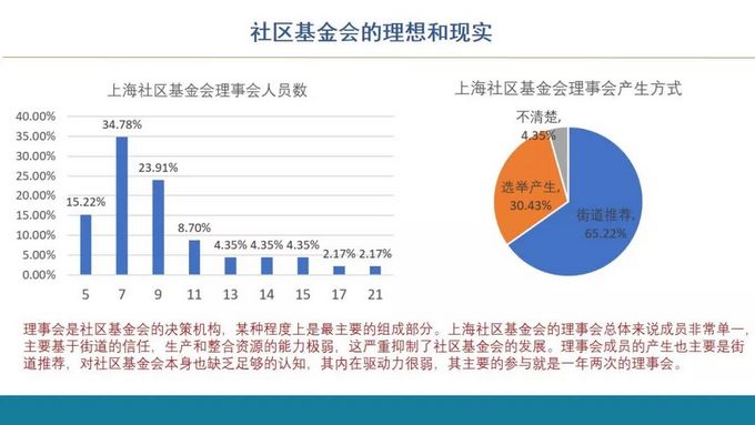 从辖区单位的企社单位的支持来看,已经有将近56%企社单位对社区基金会支持会比较大。但很大程度上都是由街道,特别是由党、党工委来统合,然后通过区域化党建的方式,把这一些辖区的相关单位联动在一起,这是我们中国社会治理结构的重要特点。