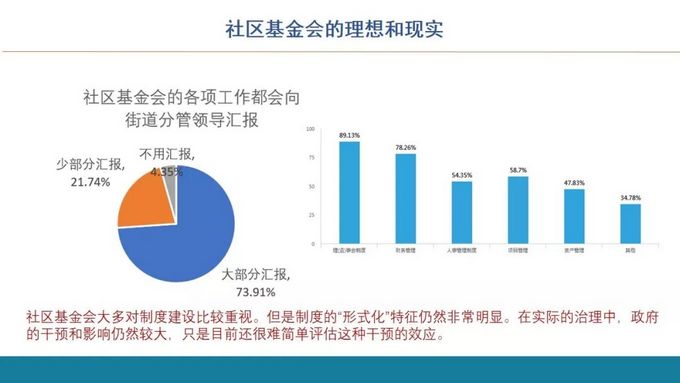从社区基金会的权限角度来看,经过统计,70%多的基金会都是要去向街道领导汇报的,当然这个汇报并不是一个坏事,这个汇报就是他其实是有利于建立跟街道政府的信任关系,但是我这里主要是讲他的授权情况,他多大属于上被完全授权的。