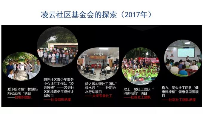 第一个社区基金会广泛的面向各种各样的自组织团队、外来的社会组织,并能够从海量的项目里形成项目库,升级符合社区需求的重点项目,品牌化然后用项目去撬动资源,到其他公募的基金会或政府相关部门去要资源。