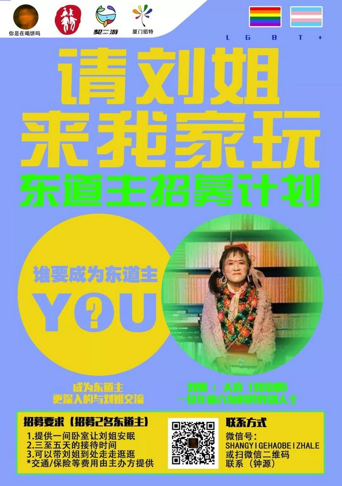 活动很简单,我们要在全国招募愿意接待刘姐来你所在城市玩几天的东道主,让你居住的社区看见刘姐,看见跨性别,引发讨论,生出任何可能。