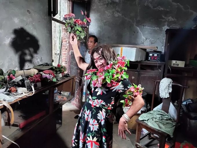 喜公益一行(包括刘培麟、唐冠华、黄金)来到河南省偃师地区,探访生活无着的异装者郭学思。郭学思年近五十岁,以拾荒和打散工为生。指派性别为男性的郭学思一直穿着女装,为人憨厚。刘培麟邀请郭学思搬迁到福州。(摄影/唐冠华)