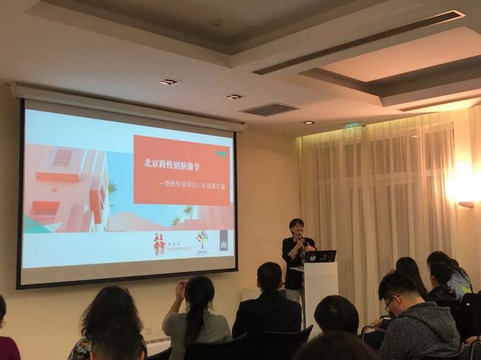 首届北京跨性别骄傲节拉开帷幕,北京同志中心跨性别部门负责人Sachi为到场嘉宾介绍跨性别项目三年成功。荷兰使馆的支持下,北京同志中心联手喜公益,发起一系列性别话题语境下的学术、艺术活动。(摄影/合作方提供)
