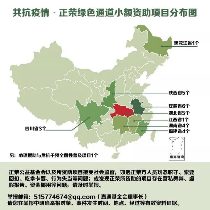 2020年1月30日,绿色通道暂时关闭,累计资助全国范围内社会组织抗击疫情项目28个,覆盖湖北、陕西、安徽等8个省份,以及包含1个全国性普及项目。正荣公益基金会将持续跟进,推动项目科学、有效、透明地开展。